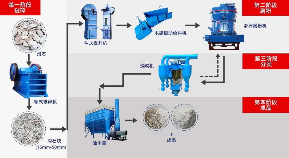 首先,大塊的滑石需要先用顎式破碎機(jī)進(jìn)行破碎處理,破碎后的滑石由斗式提升機(jī)送入到儲(chǔ)料倉中;而后電磁振動(dòng)給料機(jī)將料倉中的滑石均勻的給入到雷蒙磨粉機(jī)內(nèi)進(jìn)行磨粉作業(yè);